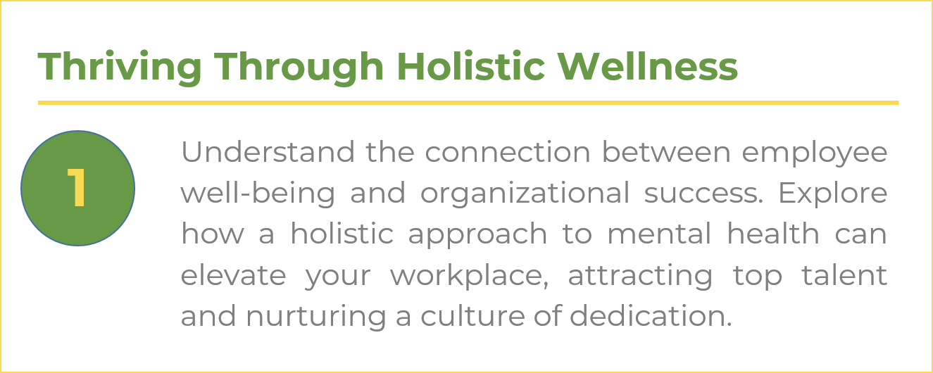 Workshop Focus: Highlight how a holistic approach to employee well-being attracts and retains top talent. Teach strategies to create a workplace that prioritizes mental health through wellness programs, flexible work arrangements, and a supportive environment.