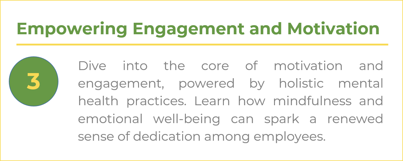 Workshop Focus: Dive into how mental well-being impacts motivation. Introduce techniques that enhance employee engagement by addressing their emotional and mental needs, ultimately boosting their overall job satisfaction.