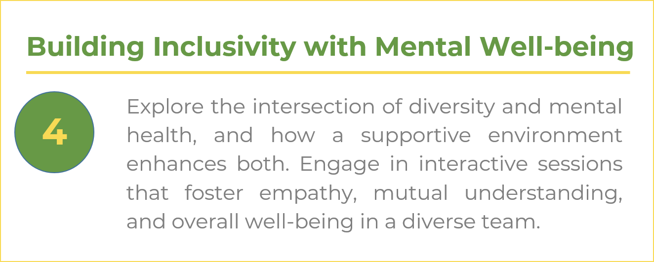 Workshop Focus: Showcase the connection between mental health and inclusivity. Guide participants through activities and discussions that promote empathy, understanding, and mental well-being in a diverse workforce.