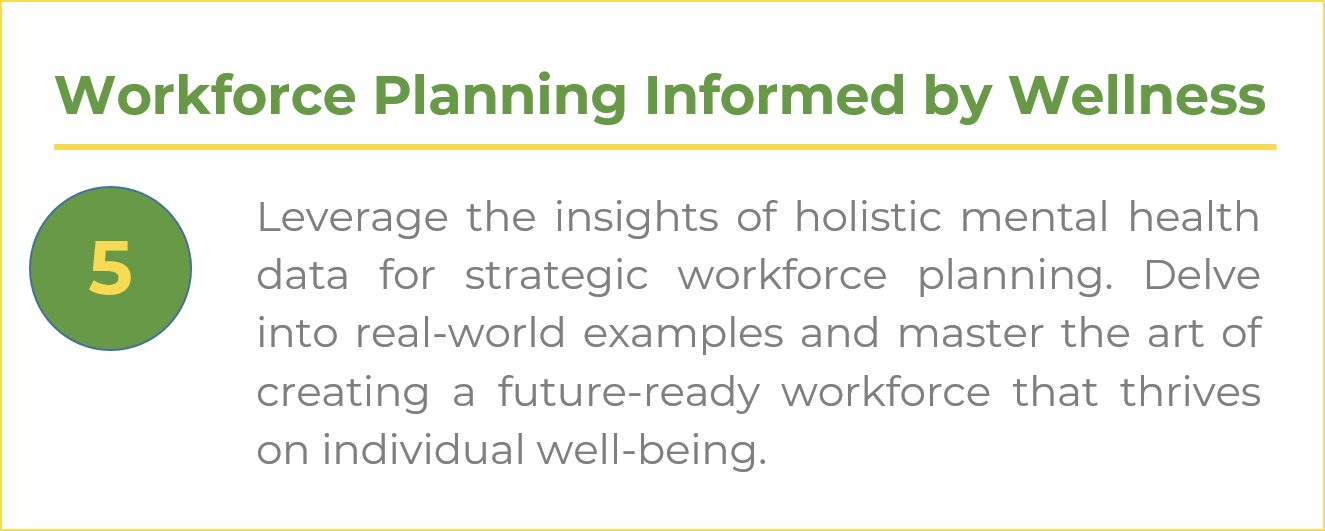 Workshop Focus: Explore how holistic mental health insights can guide effective workforce planning. Teach HR professionals and managers to use mental wellness data to anticipate employee needs and align the workforce with organizational goals.